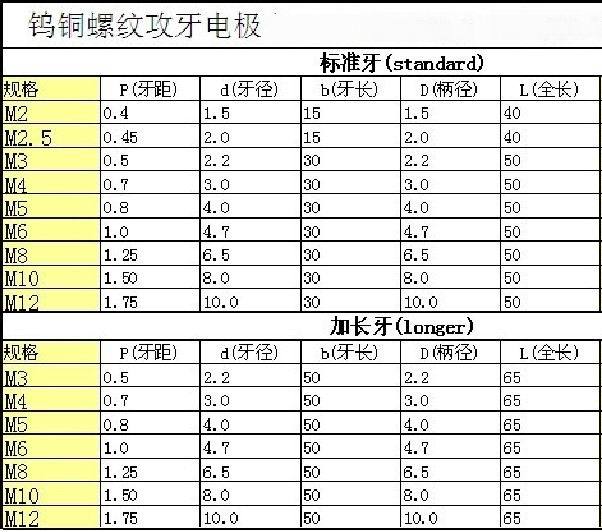 鎢銅螺紋電極規(guī)格表: